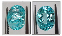 帕拉伊巴碧玺充填处理所用的材料往往是一些有机高分子聚合材料,。据报道,以祖母绿充填处理工艺著称的美国宝石改善处理公司现已开始接受对碧玺充填处理的业务了,其中包括帕拉伊巴碧玺。从其展示帕拉伊巴碧玺充填处理前后效果对比图上看,外观差异很大(如图2),其处理前后可能的价格变化之大可想而知,因此充分揭示是否经过充填、充填处理的程度等,对消费者而言是相当重要的。
